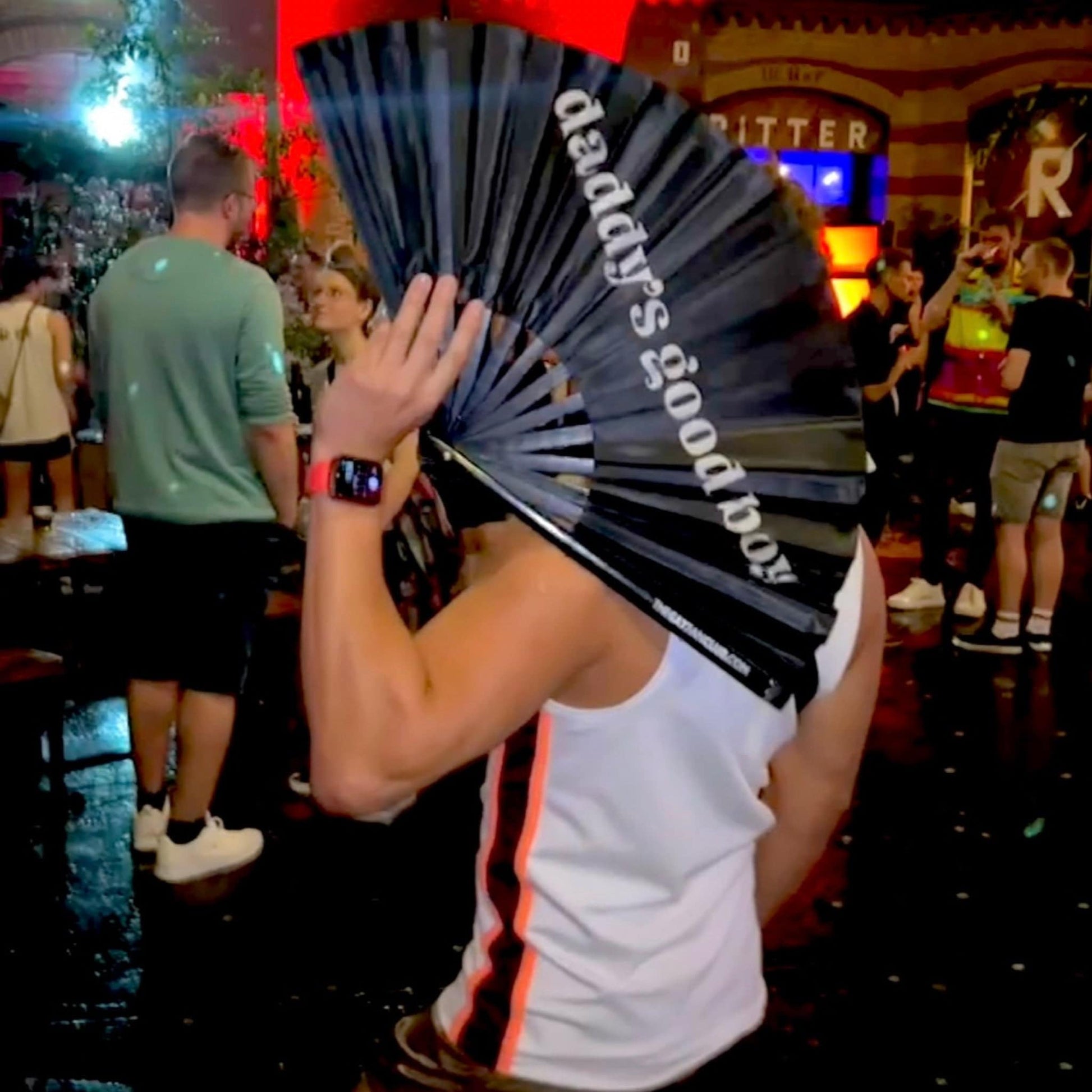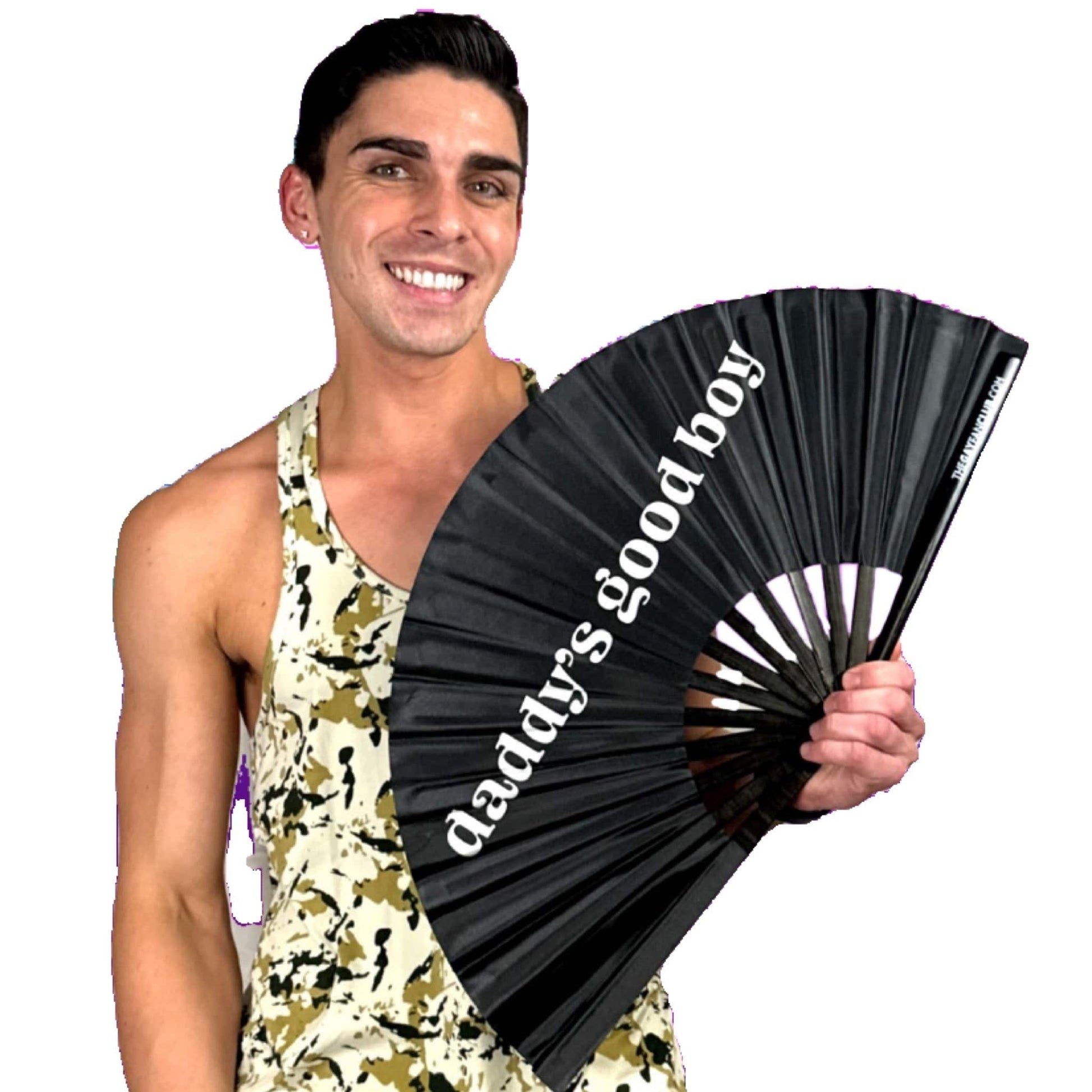The Daddy's Good Boy Fan is a black and white bamboo hand fan for raves that is for the flirty, the favored, and the fully certified good boys at raves. Whether it’s praise, play, or just owning your role in the queer food chain, this black clack fan claps back with style. Serve this one up at raves, circuit parties, drag brunch or across the dance floor — Daddy’s watching, and you understood the assignment.